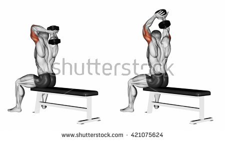 echanics The seated tricep press is one of the more well-known exercises for arm building. Then repeat with your right arm. 6. Then lower the bar behind your head by bending your elbows. Repeat for as many reps and sets as desired. This exercise is a variation of the bench press. Sit down on a bench with back support and grab a dumbbell with both your hands and hold it overhead at arms length. Holding one dumbbell with both your hands, stand with your feet at hip-width apart. Your elbows should be in close to your head and the arms should be perpendicular to the floor with the knuckles pointing to the ceiling.